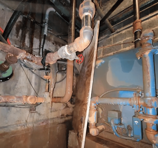 In steam heating systems, the liquid formed when steam releases heat energy and condenses into water mixed with dissolved gases. Condensate must be drained out of the system so it does not cool the remaining steam, leak onto floors, or create water hammer.