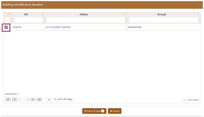 - In the Building Identification Number pop-up window, check the box(es) by the BIN(s) for this payment then select Select & Add.