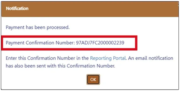 Payment Confirmation Number. This is the number to be submitted in the Reporting Portal. It will also be sent to you by email.