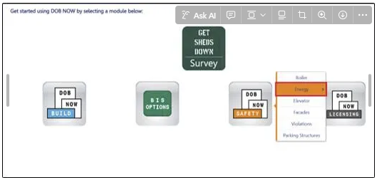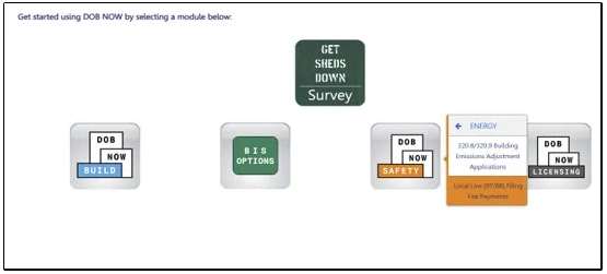 - After logging into DOB NOW, the Welcome page displays. Hover over DOB NOW: Safety and click Energy.
