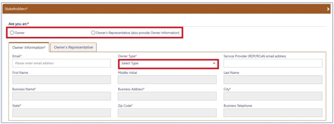 In the Stakeholders section, select your role: Owner or Owner’s Representative. The information of the logged in user will auto-populate in the selected section. Owner information is required.