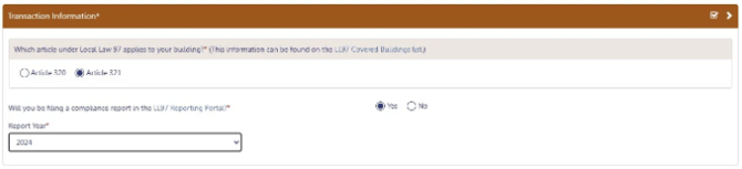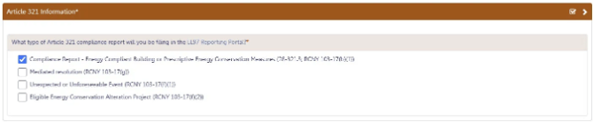 - Select Article 321 to indicate your compliance pathway. Compliance requirements can be confirmed on the LL97 Covered Buildings List.