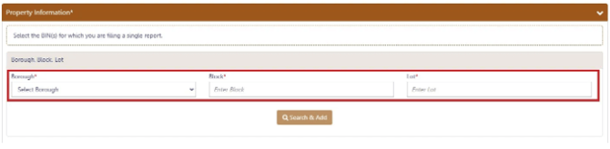 - In the Property Information section, enter the Borough, Block and Lot and click Search & Add.